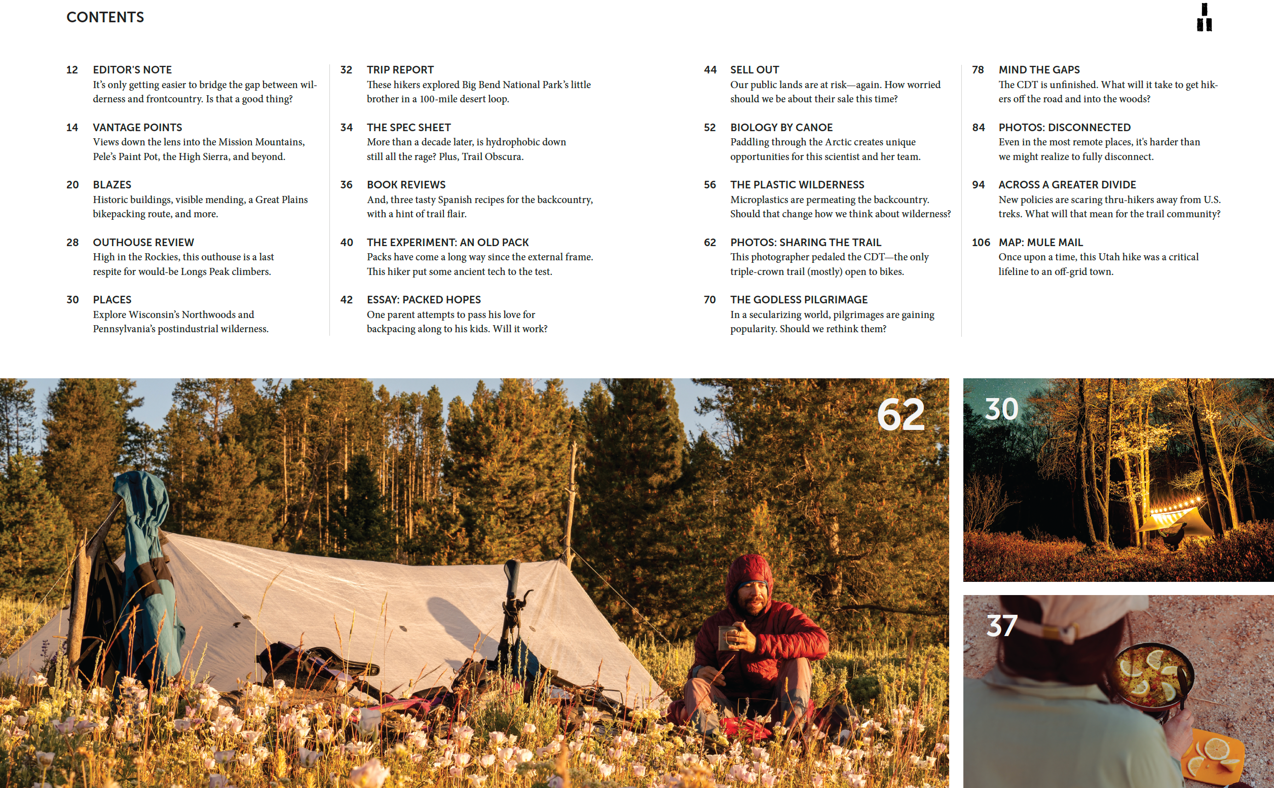 Trails Magazine's 11th Issue features a cover image from the Washington Cascades, shot by Tiffanie Yang, enclosing stories about the last gaps on the Continental Divide Trail, how federal policies are scaring away thru-hikers, the future of the pilgrimage in a secular world, and microplastics in the wilderness. Plus, the NPS office maintaining historic buildings, a new bikepacking route through the Great Plains, Miranda Webster's Trail Obscural, recipes, trip reports, maps, and more, printed on hefty 80-pound paper with fewer ads than any other magazine. Stories in this latest issue include:
