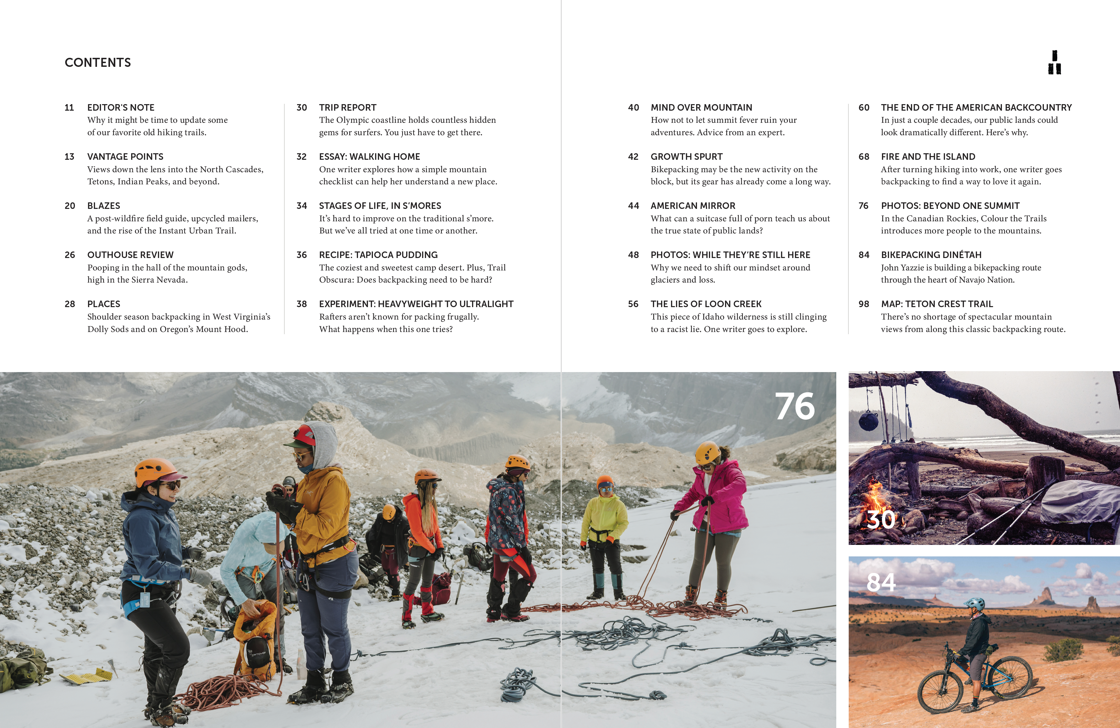 As always, our "spring" issue features delicious backpacking recipes, trip reports from amazing adventures, beautifully illustrated trail maps, tons of big photos, and the best backpacking stories you can find anywhere, and it's all printed on hefty 80-pound paper with fewer ads than any other magazine. Stories in this latest issue include: