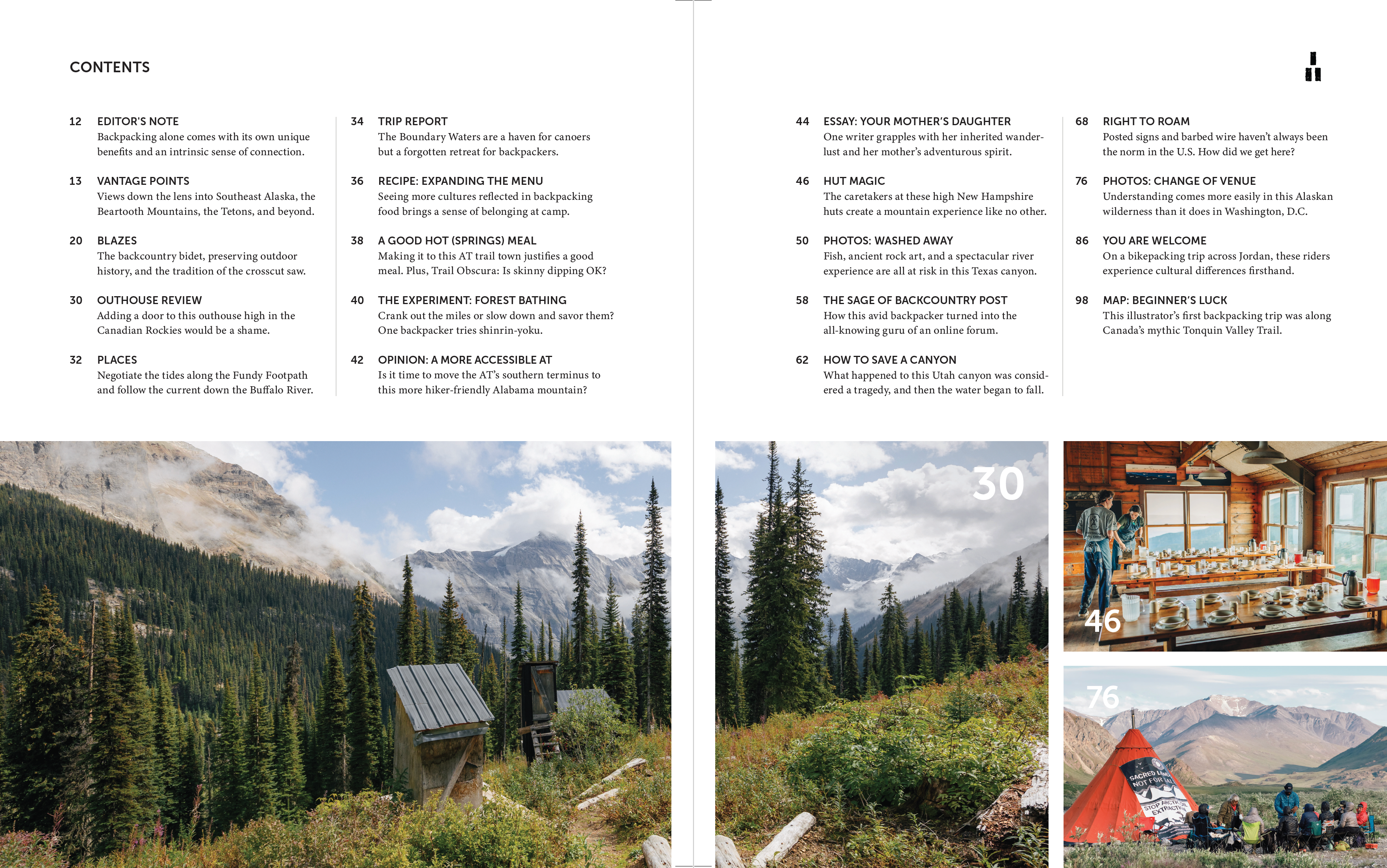 As always, this issue features delicious backpacking recipes, trip reports from amazing adventures, beautifully illustrated trail maps, tons of big photos, and the best backpacking stories you can find anywhere, and it's all printed on hefty 80-pound paper with fewer ads than any other magazine. Stories in this latest issue include: